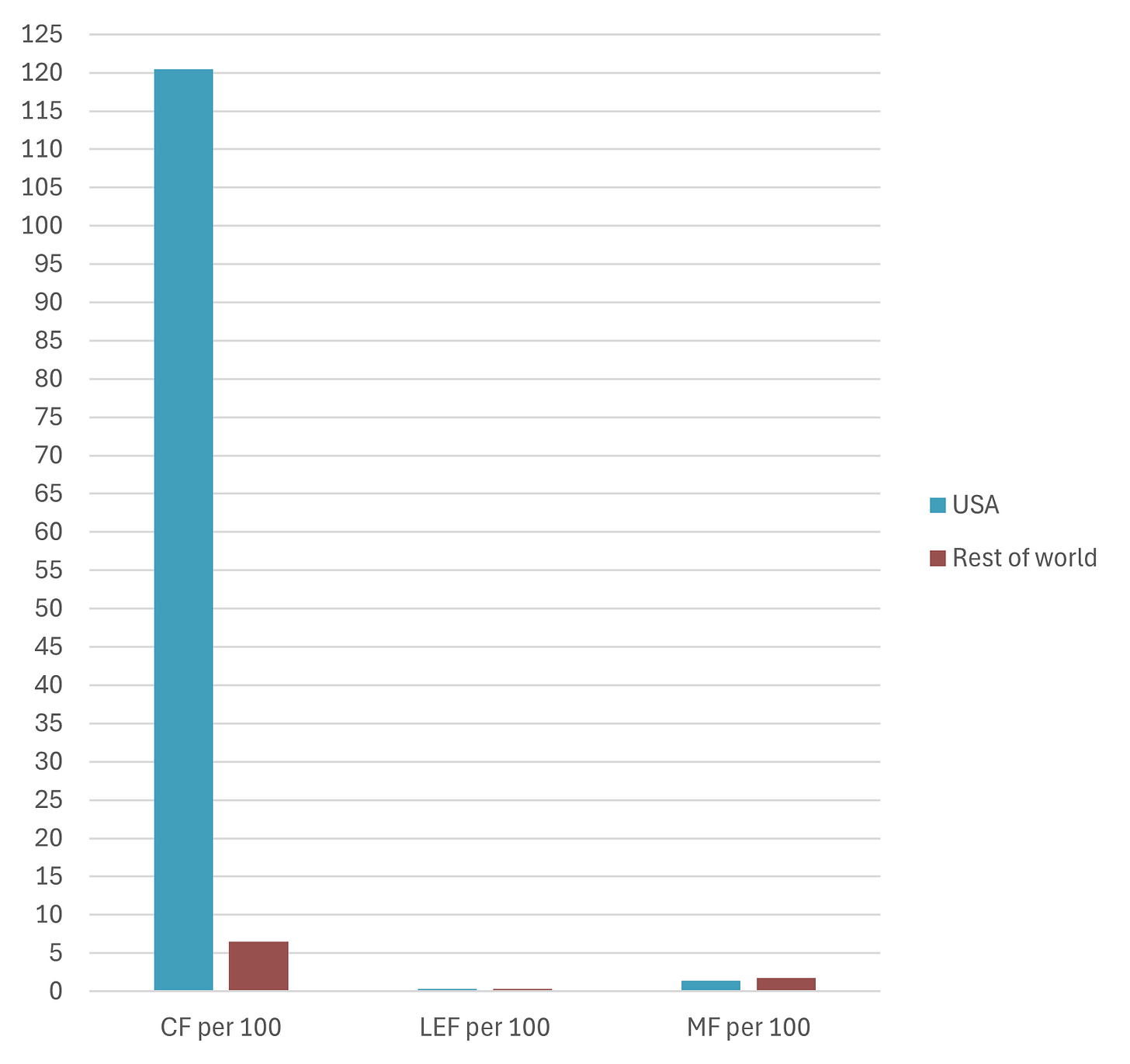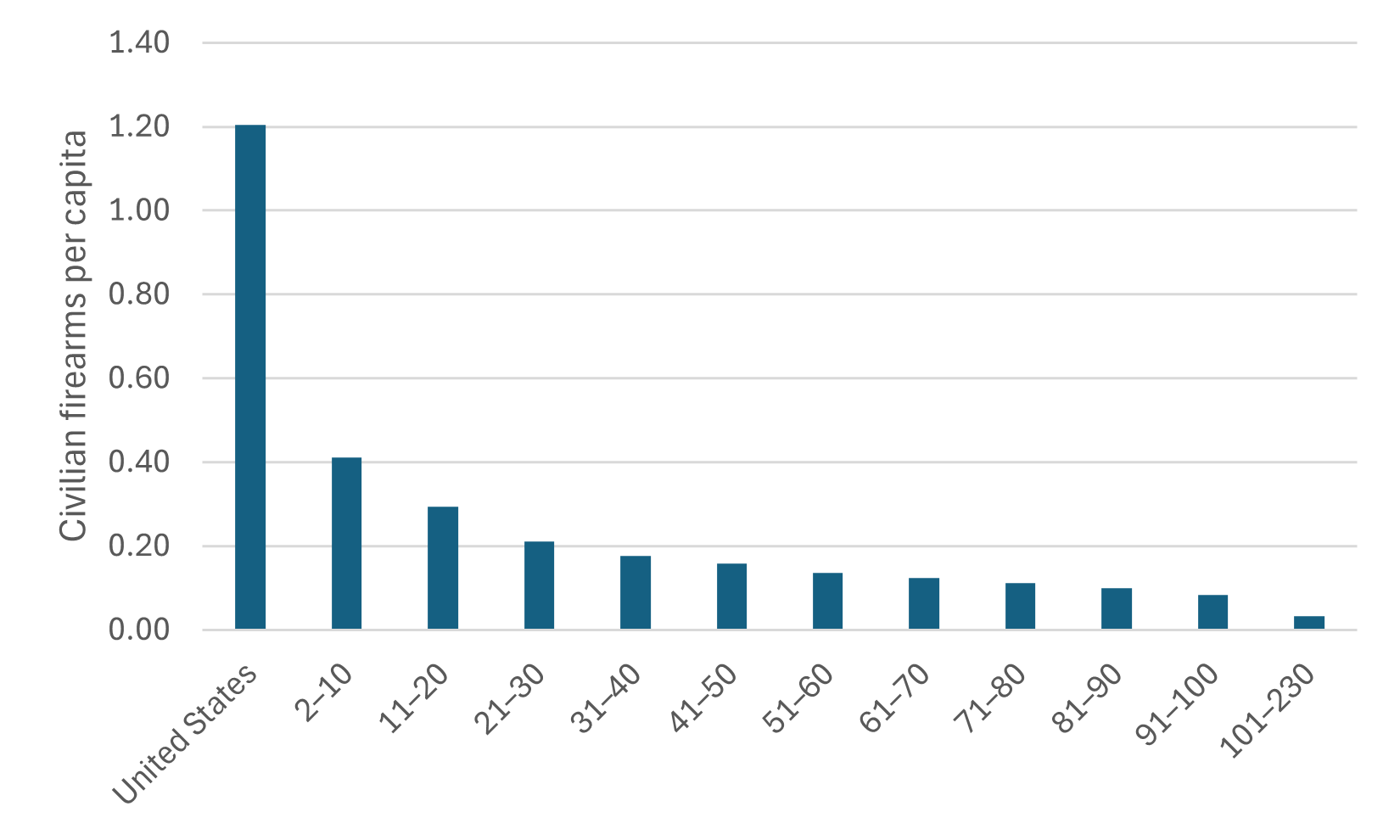 Also noteworthy is the per-capita distribution of guns. In this regard, the United States is an outlier as well. Over 98 percent of its guns are in civilian hands, compared with about 75 percent in the rest of the world. Conversely, almost 21 percent of guns in the rest of the world are military, whereas the American proportion is only 1.1 percent (Figure 3).